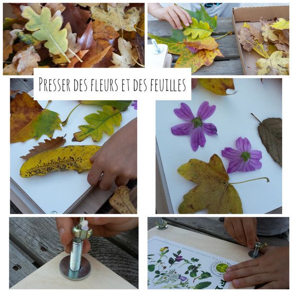 Les enfants ont bien aimé préparer la presse (enlever les écrous), disposer les feuilles et fleurs, poser les feuilles et cartons de protection et enfin presser le plus possible avec les écrous à papillons.